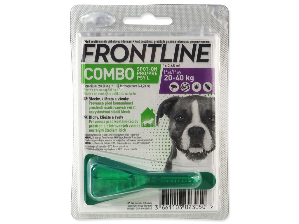 Frontline Combo Spot-On Dog L 1x2,68ml - velmi účinný přípravek k ochraně psů před blechami, klíšťaty a všenkami. Frontline Combo účinkuje okamžitě po aplikaci, roztok je zcela voděodolný. Ihned parazity zahubí a zničí veškeré larvy a vajíčka. Přípravek nezapáchá, nešpinía nemastí srst.