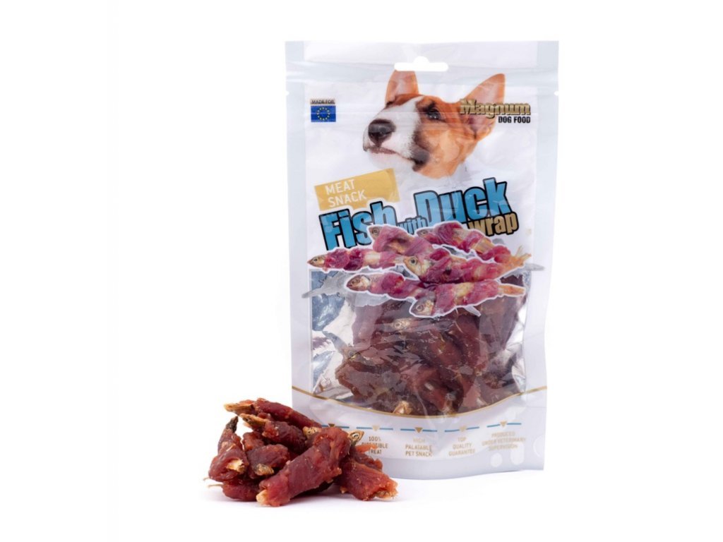 Měkká, přírodní masová pochoutka pro psy. Sušené rybky omotané proužkem kachní svalovinyDetailní popis produktu