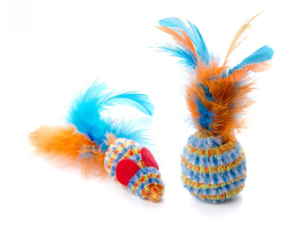 Míček a myška s pírkem, plyšová (plastová) hračka