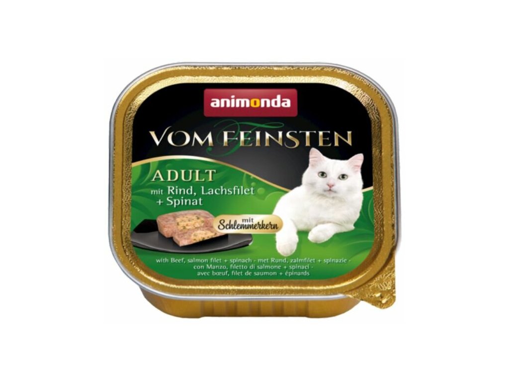 Vysoce kvalitní paštika Von Feinsten CORE s hovězím masem, filetem z lososa a špenátem pro dospělé kočky všech plemen.